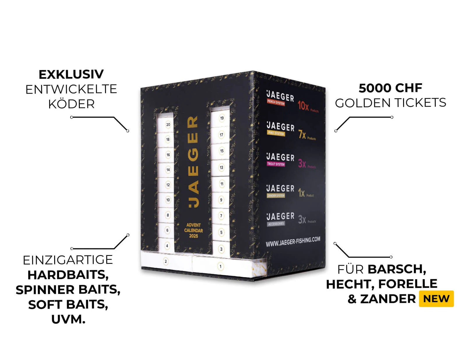 Hinter manchen Türchen steckt nicht nur Angel-Action – sondern echtes Glück. Golden Tickets bringen dir exklusive Extras im Gesamtwert von über 5000 CHF. Von JAEGER Shop-Gutscheinen bis hin zu kompletten Zielfischboxen – Perch Go Kit, Trout Go Kit oder Pike Go Kit. Jeden Tag eine neue Chance. Für goldene Momente.