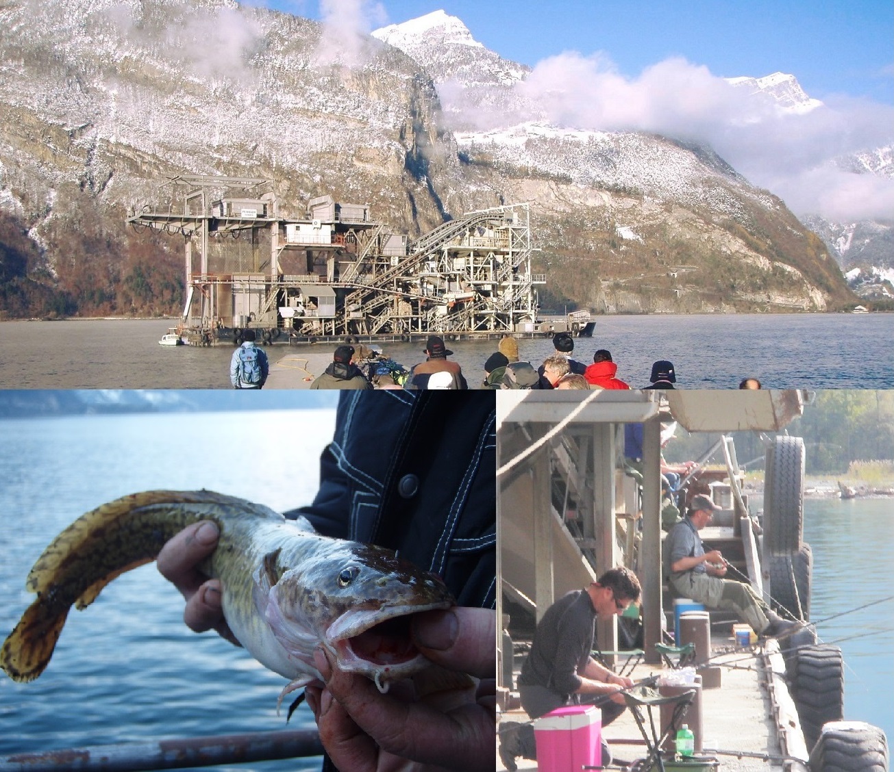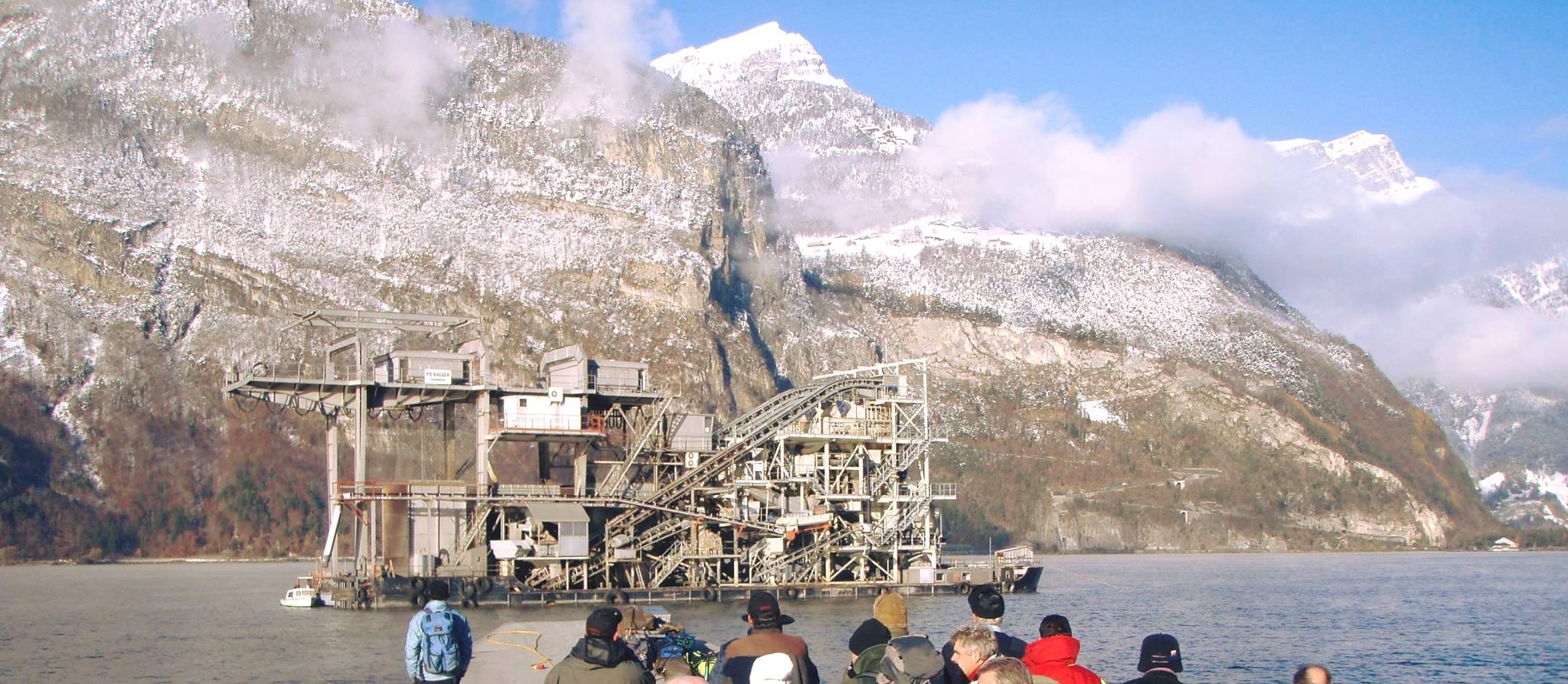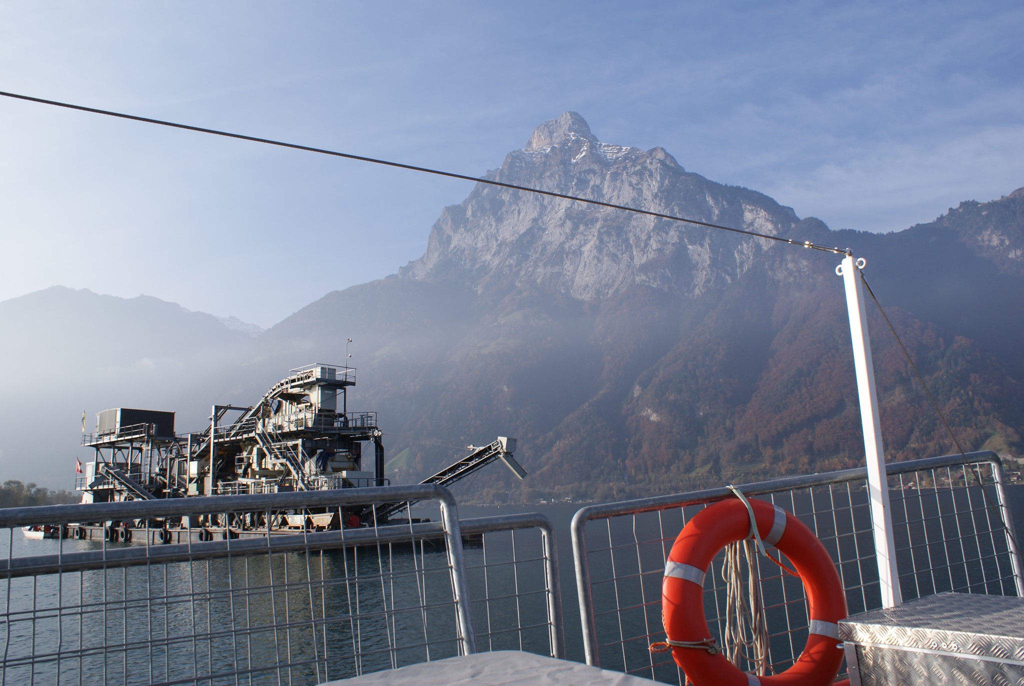 Gefischt wird vom fest verankerten Schwimmbagger. Im schönen Reuss-Delta auf dem Urnersee in einer Tiefe von ca. 60-80m.