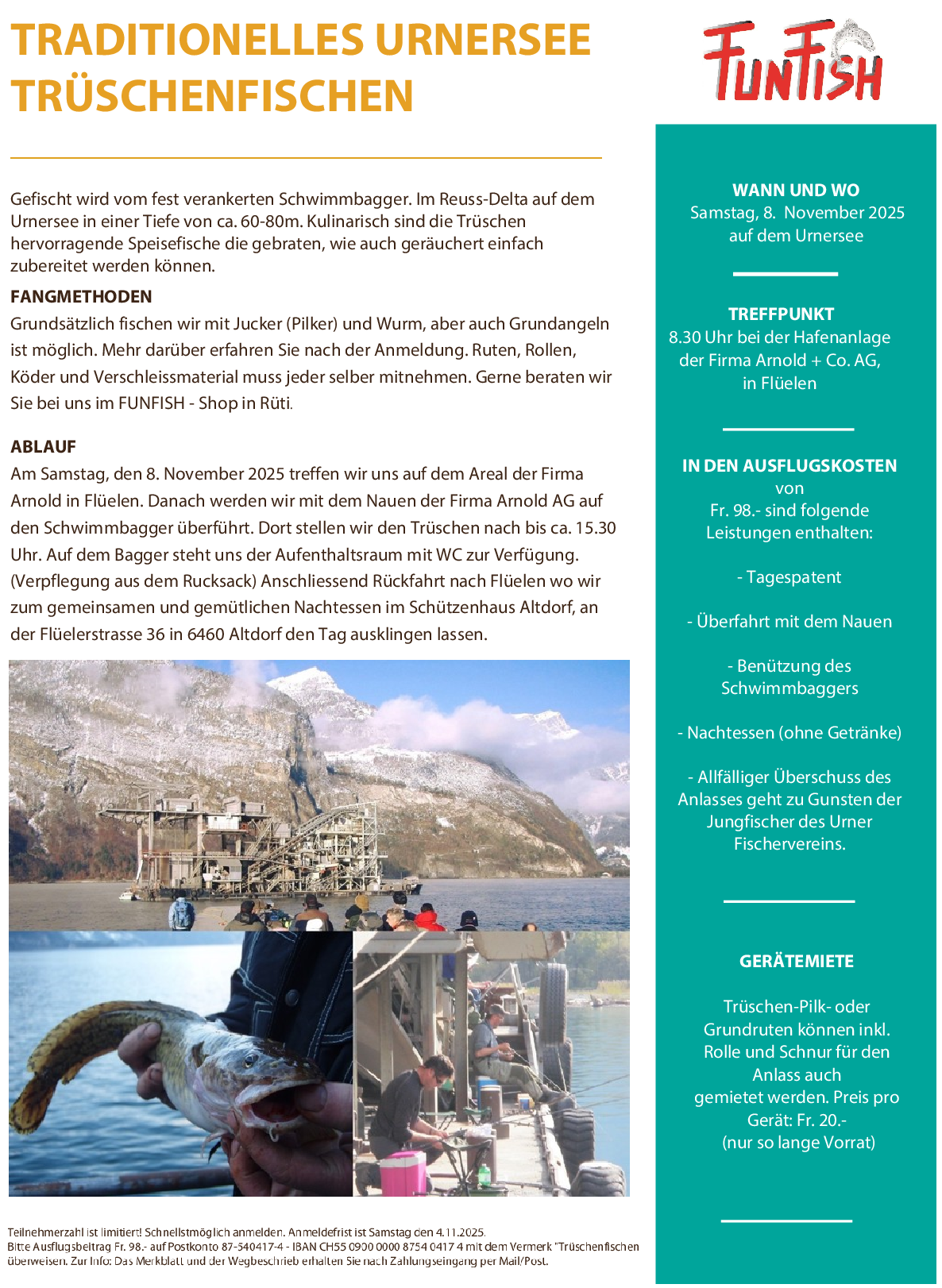 Am Samstag, den 8. November 2025 treffen wir uns auf dem Areal der Firma Arnold in Flüelen. Danach werden wir mit dem Nauen der Firma Arnold AG auf den Schwimmbagger überführt. Dort stellen wir den Trüschen nach bis ca. 15:30 Uhr. Auf dem Bagger steht uns der Aufenthaltsraum mit WC zur Verfügung. (Verpflegung aus dem Rucksack) Anschliessend Rückfahrt nach Flüelen wo wir zum gemeinsamen und gemütlichen Nachtessen im Schützenhaus Altdorf, an der Flüelerstrasse 36 in 6460 Altdorf den Tag ausklingen lassen.